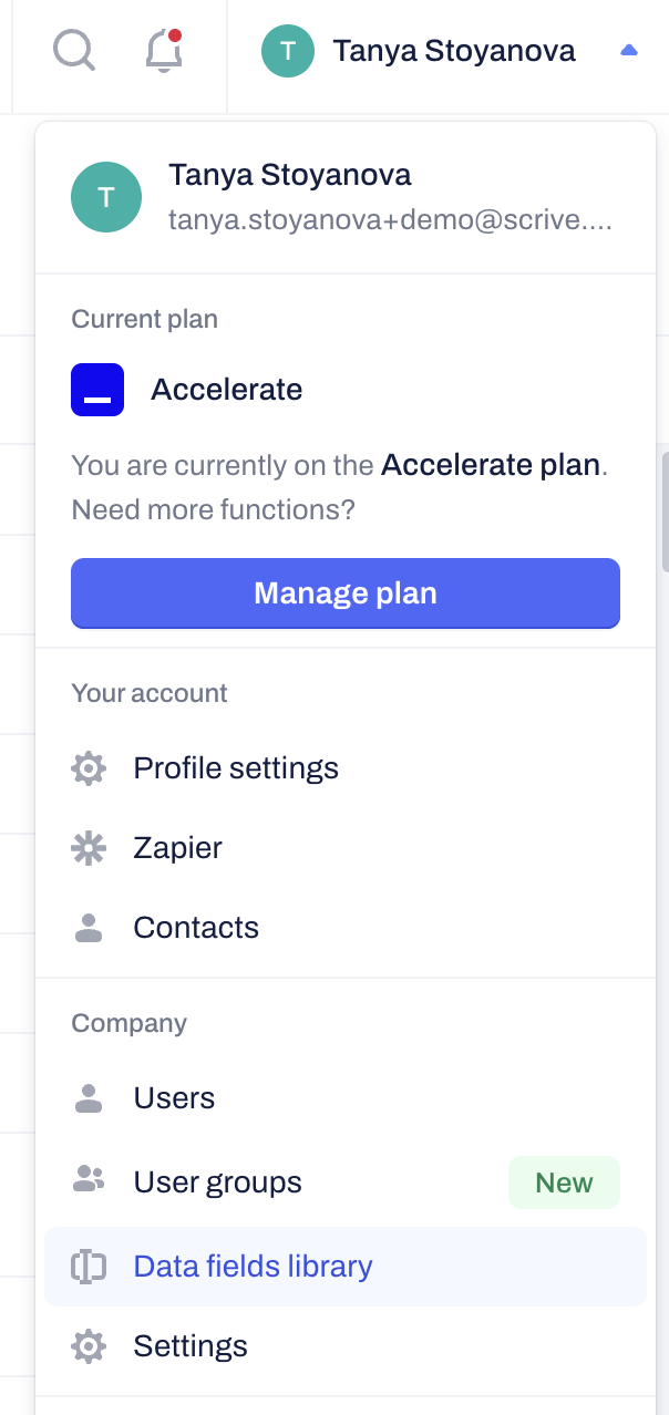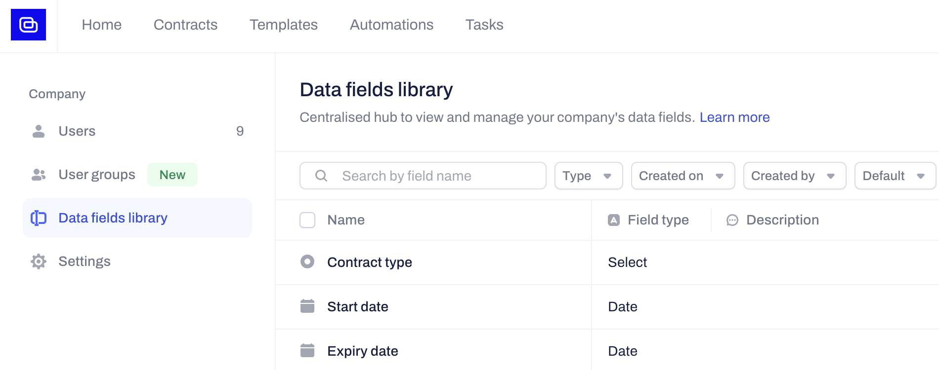 Centralizing your contracts data begins with creating unique, standardized data fields. Users with the Manage data fields library permission can add or modify fields: