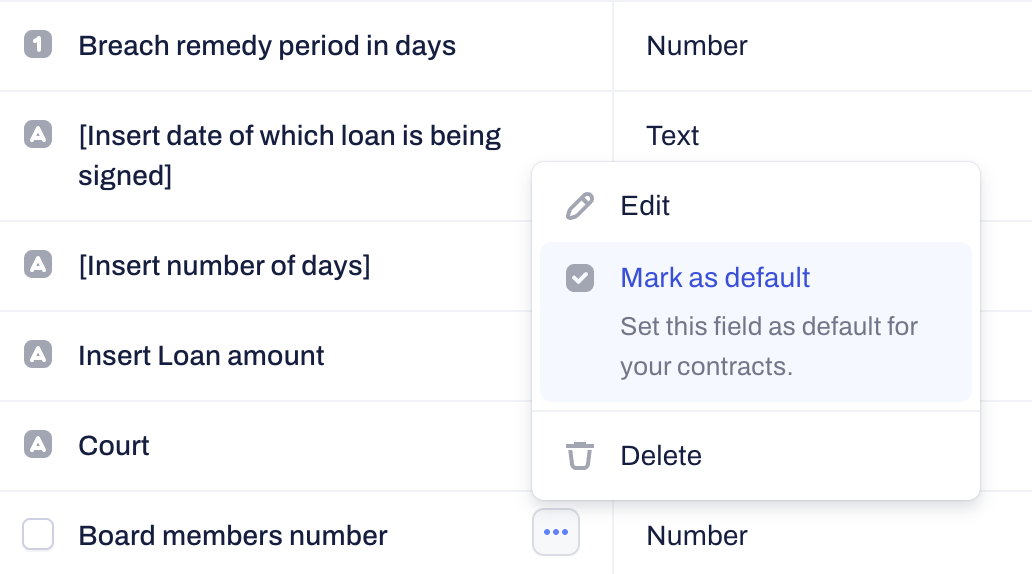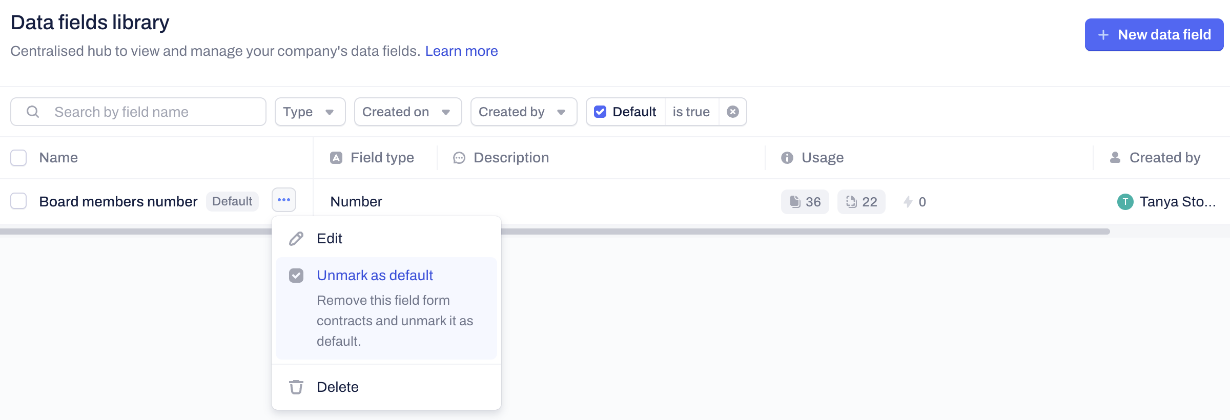 Users with the Manage data fields library permission enabled can set "Default" fields. These fields automatically appear in all new templates, drafts, and contracts created by anyone in the company to ensure contract data standardization: