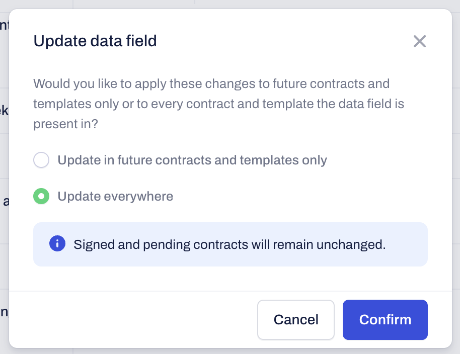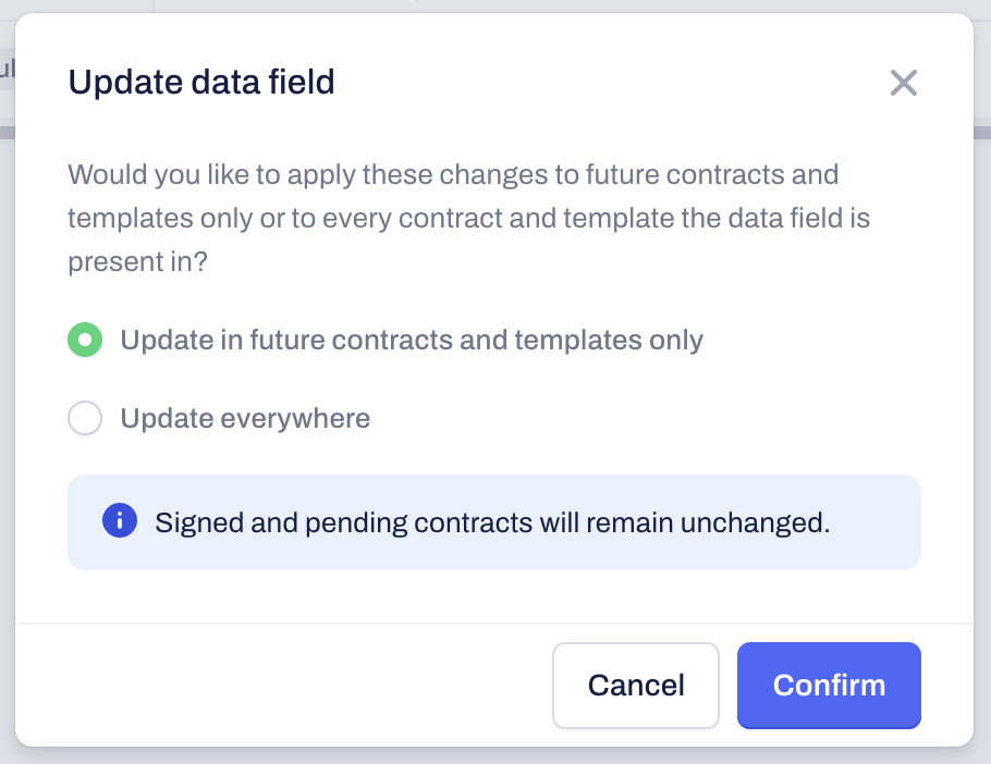 You can pick to unmark the field as default in future contracts and templates only, or in every contract and template the data field is present in: