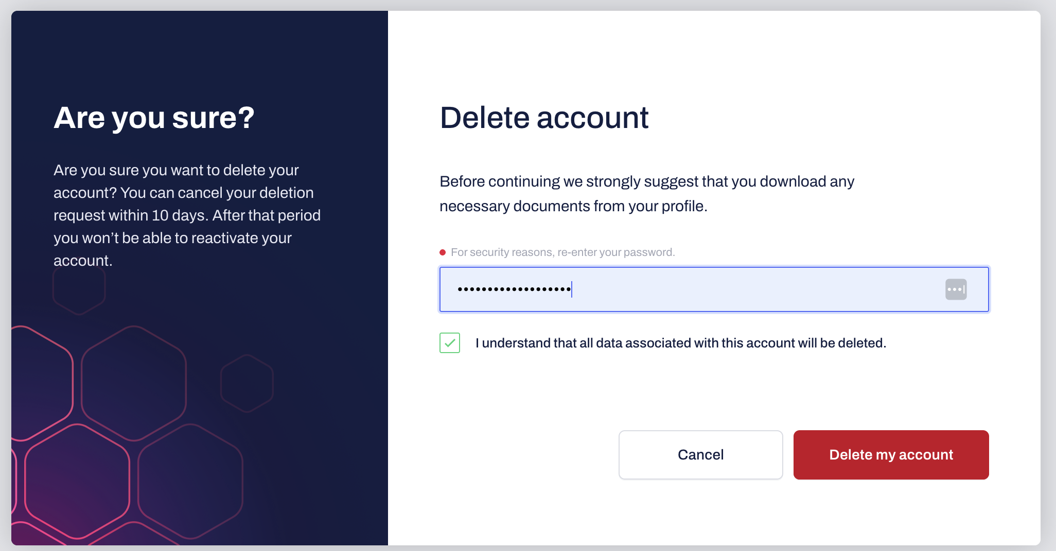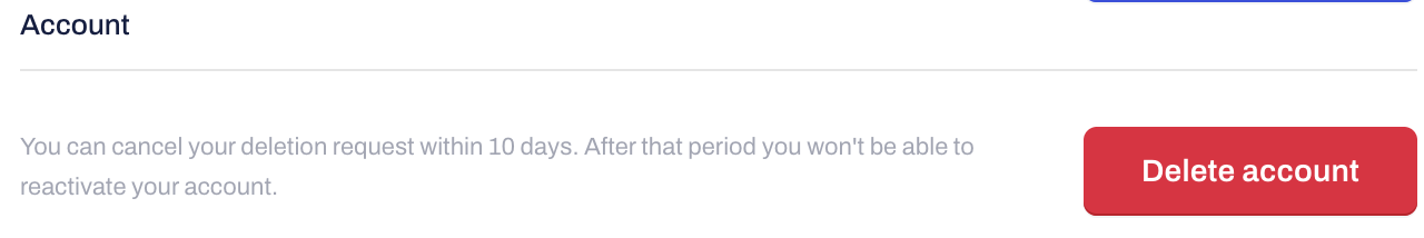 Confirm the deletion. Once clicked, your account deactivates immediately, but you have ten days to revoke this decision by contacting our Support team before permanent removal.