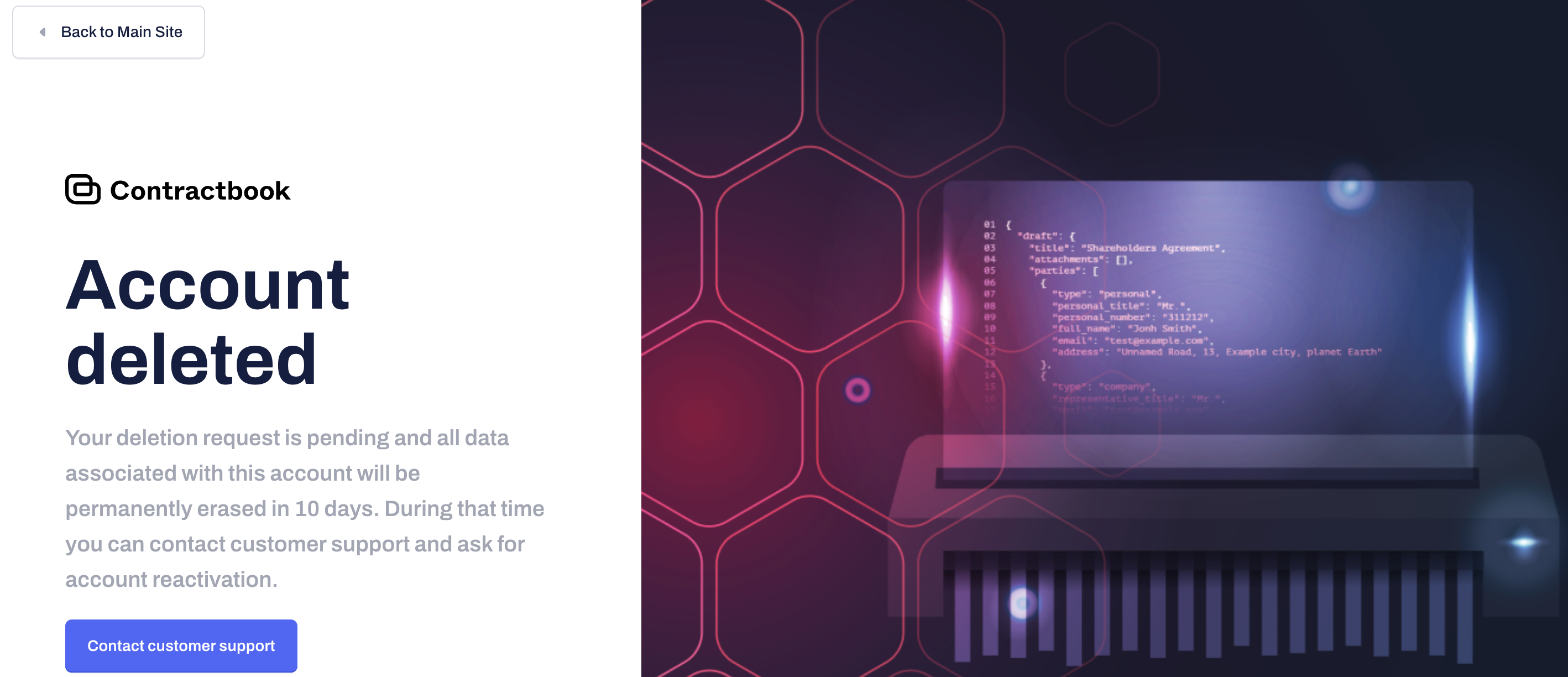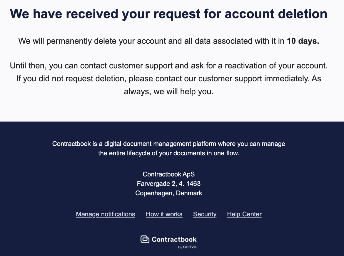 Deleted Private Users: Access is immediately blocked upon deletion. If the user tries to log in within the 10-day revocation window, they must contact the Contractbook Support team to cancel the deletion and restore the account. After 10 days, the account is permanently erased.