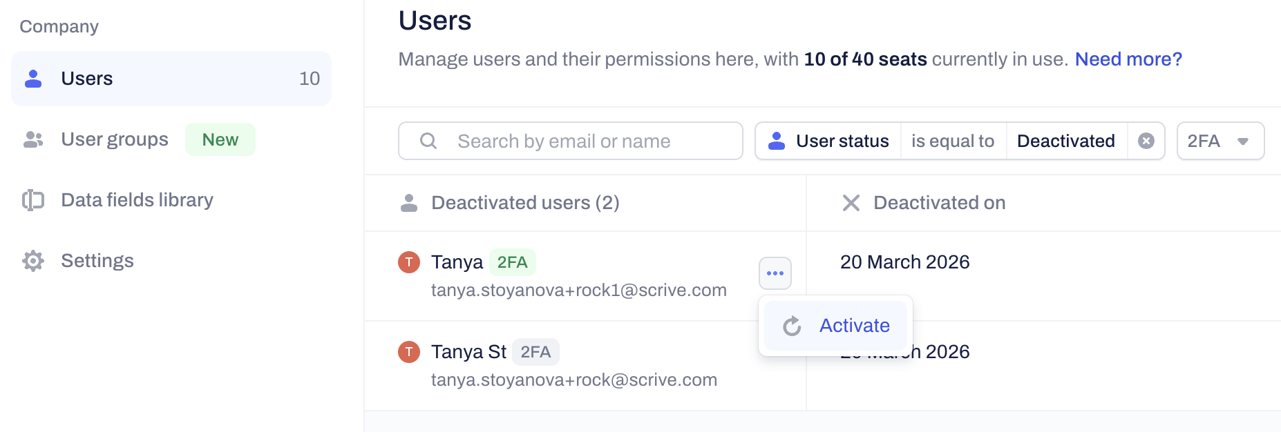 Note: Reactivating a user will immediately assign them an active paid seat in your company's subscription. Ensure you have an available seat before completing this action. Contact our Support team or your CSM if you need additional seats.