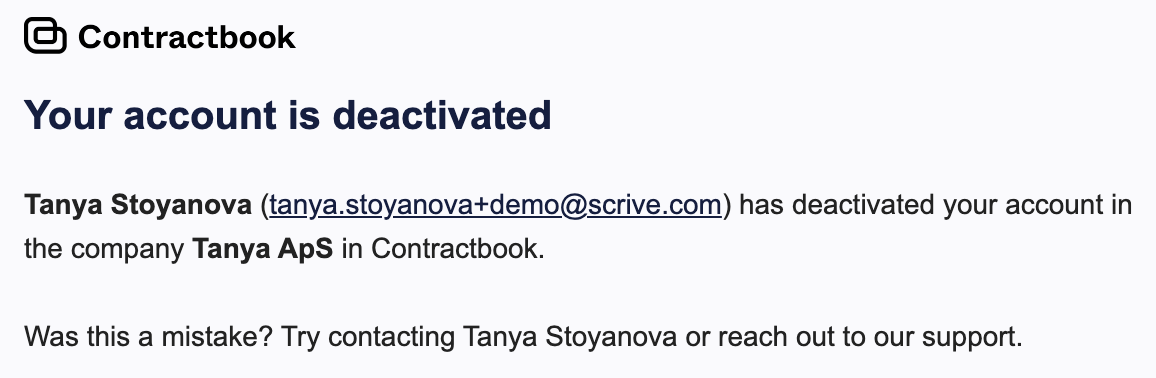 Deactivated Company Users: Attempting to log in will trigger an error message stating the account is inactive. The user must contact their company's internal Contractbook Admin to request reactivation.