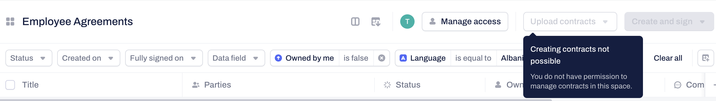 Note: You need Manage contracts permissions within the specific Space to add contracts. Without this Space-level permission, you will not be able to use the buttons to upload or create contracts, regardless of your global company user permissions.