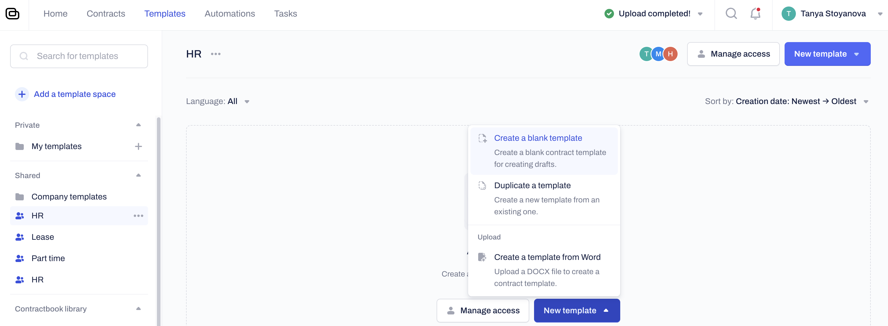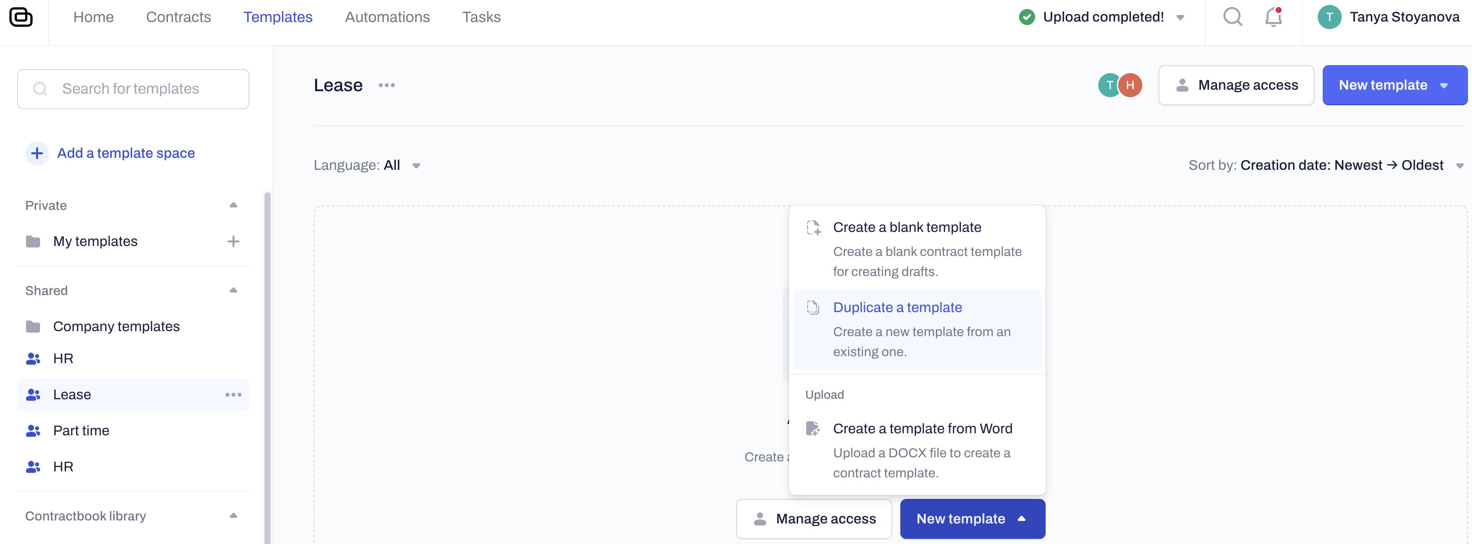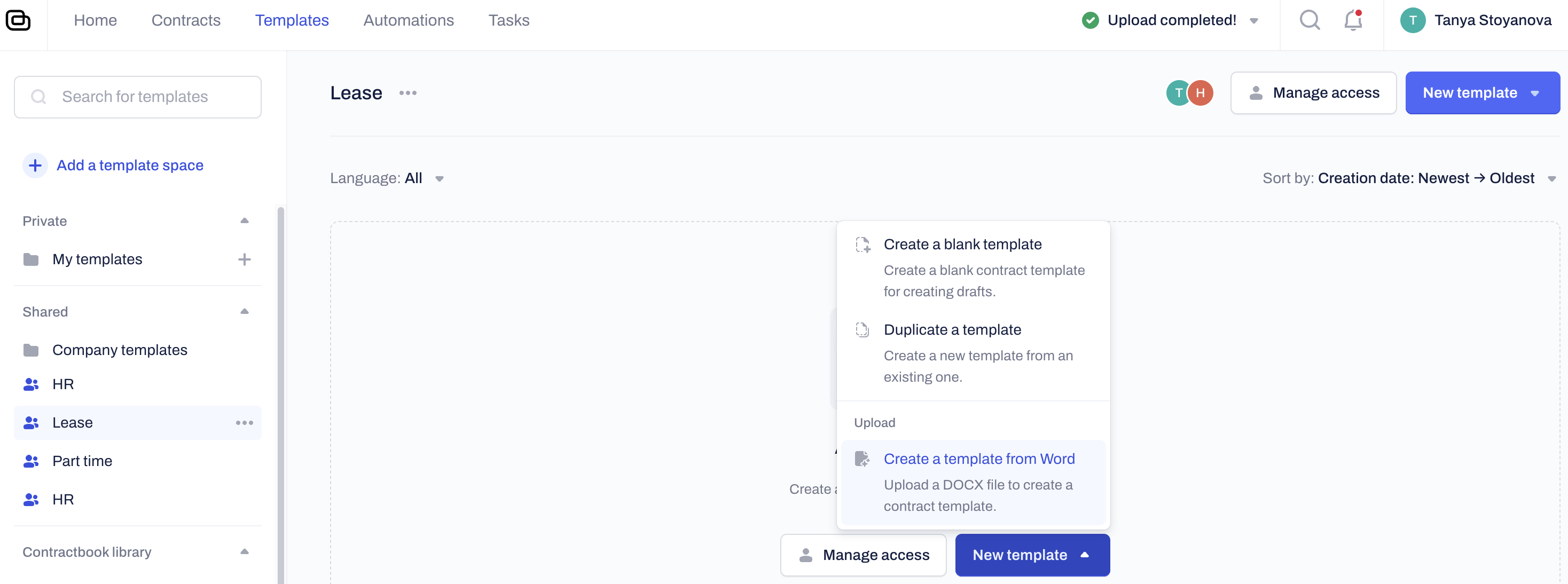 Building a robust shared Template Space allows all Users to generate consistent, company-approved contracts. Use these methods to add templates: